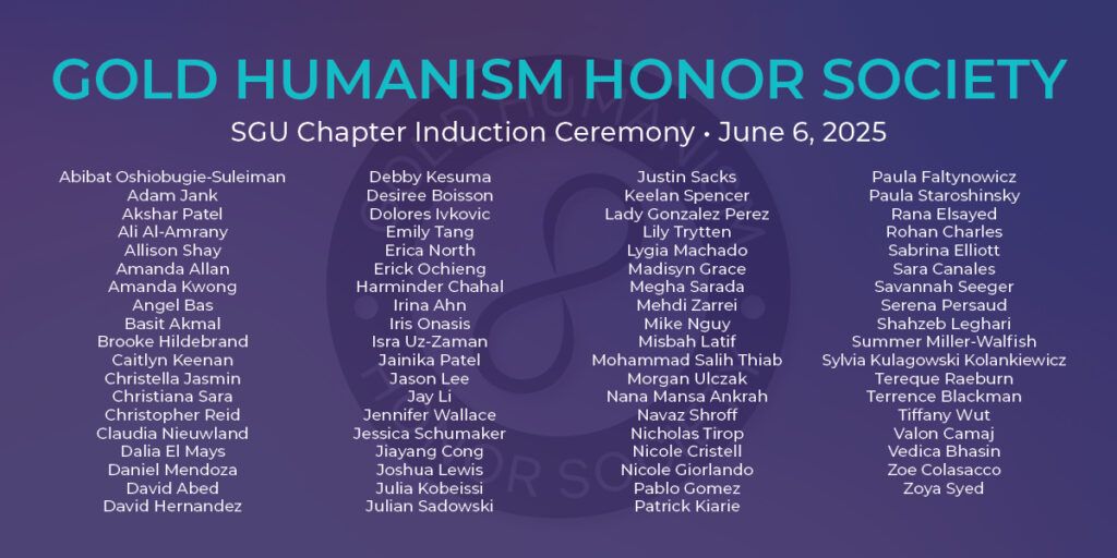 Since SGU established its GHHS chapter in 2005, the Society has recognized outstanding medical students who exemplify clinical excellence, leadership, empathy, and a strong commitment to service. Those selected for induction rank in the top 10 percent of their class and are frequently engaged in volunteer and community outreach efforts.